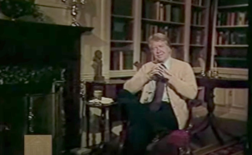 Global environmental awareness had grown to a movement large enough to be seized upon by newly-elected American president Jimmy Carter who, within a month of taking office, donned a cardigan sweater, sat before a roaring White House fire, and urged Americans to join him in conserving energy in a nationally-televised fireside chat.