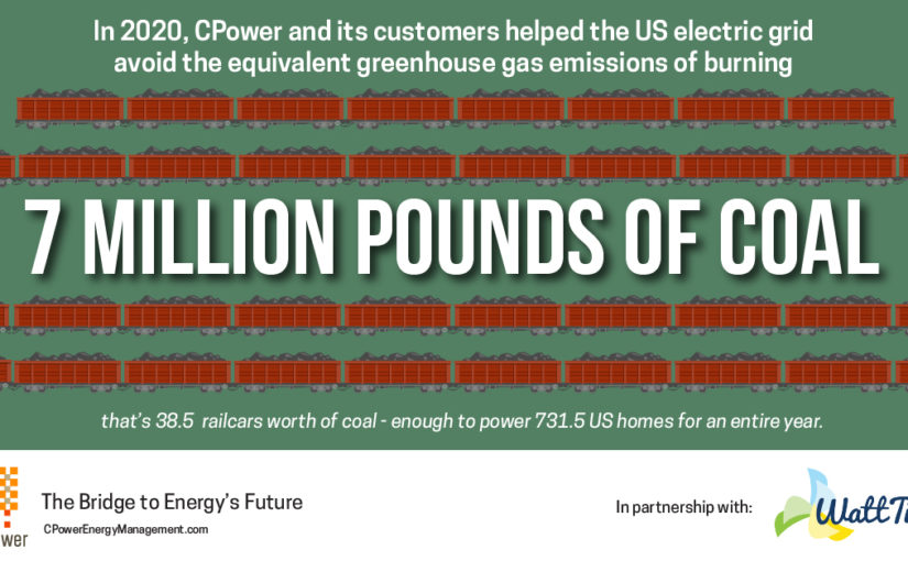 In 2020, CPower customers curtailed their grid demand in nearly 20,000 events spread across six independent system operator (ISO) regions, totaling 11.5 GWh of load reduction. Based on WattTime’s analysis, this corresponded to an emissions reduction of nearly 7,000 metric tons of carbon dioxide on average for demand response events alone. This is equivalent to eliminating the greenhouse gas (GHG) emissions associated with over 7 million pounds of coal burned.